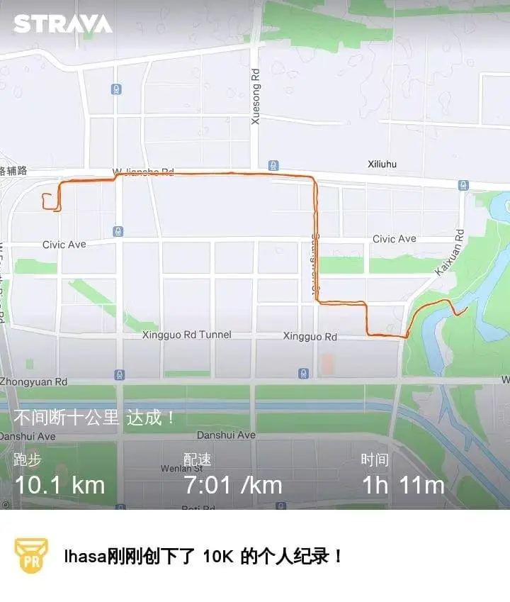 到小区门口了,我感到非常兴奋,因为我即将完成我的第一次半马挑战,而且是不间断,除了中途买水,期间几乎没有停过