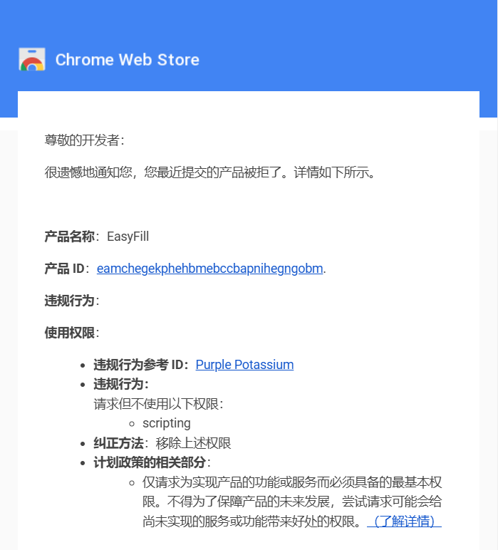 content_scripts: [  {    matches: ["<all_urls>"],    js: ["content-scripts/content.js"],  },];删除scripting参数后,重新打包并再次向 Chrome Web Store 提交了扩展。